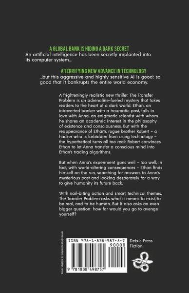 A GLOBAL BANK IS HIDING A DARK SECRET An artificial intelligence algorithm has been secretly implanted into its computer system... A TERRIFYING NEW ADVANCE IN TECHNOLOGY ...but this aggressive and highly sensitive AI is good: so good that it bankrupts the entire world economy. A frighteningly realistic new thriller, The Transfer Problem is an adrenaline-fueled mystery that takes readers to the heart of a dark world. Ethan, an introverted banker with a traumatic past, falls in love with Anna, an enigmatic scientist with whom he shares an academic interest in the philosophy of existence and consciousness. But with the reappearance of Ethan's rogue brother Robert - a hacker who is forbidden from using technology - the hypothetical turns all too real: Robert convinces Ethan to let Anna transfer a conscious mind into Ethan's trading algorithms. But when Anna's experiment goes well - too well, in fact, with world-altering consequences - Ethan finds himself on the run, searching for answers to Anna's mysterious past and looking desperately for a way to give humanity its future back. With nail-biting action and smart, technical themes, The Transfer Problem asks what it means to exist, to be real, and to be human. But it also asks an even bigger question: how far would you go to avenge yourself?