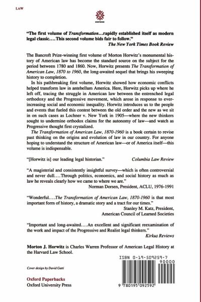 When the first volume of Morton Horwitz's monumental history of American law appeared in 1977, it was universally acclaimed as one of the most significant works ever published in American legal history. The New Republic called it an "extremely valuable book." Library Journal praised it as "brilliant" and "convincing." And Eric Foner, in The New York Review of Books, wrote that "the issues it raises are indispensable for understanding nineteenth-century America." It won the coveted Bancroft Prize in American History and has since become the standard source on American law for the period between 1780 and 1860. Now, Horwitz presents The Transformation of American Law, 1870 to 1960, the long-awaited sequel that brings his sweeping history to completion. In his pathbreaking first volume, Horwitz showed how economic conflicts helped transform law in antebellum America. Here, Horwitz picks up where he left off, tracing the struggle in American law between the entrenched legal orthodoxy and the Progressive movement, which arose in response to ever-increasing social and economic inequality. Horwitz introduces us to the people and events that fueled this contest between the Old Order and the New. We sit in on Lochner v. New York in 1905--where the new thinkers sought to undermine orthodox claims for the autonomy of law--and watch as Progressive thought first crystallized. We meet Oliver Wendell Holmes, Jr. and recognize the influence of his incisive ideas on the transformation of law in America. We witness the culmination of the Progressive challenge to orthodoxy with the emergence of Legal Realism in the 1920s and '30s, a movement closely allied with other intellectual trendsof the day. And as postwar events unfold--the rise of totalitarianism abroad, the McCarthyism rampant in our own country, the astonishingly hostile academic reaction to Brown v. Board of Education--we come to understand that, rather than self-destructing as some histori