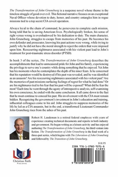 The Transformation of John Gruneburg is a suspense novel whose theme is the timeless struggle of good over evil. This fictional narrative focuses on an exceptional Naval Officer whose devotion to duty, honor, and country entangles him in rogue missions tied to a top secret CIA covert operation. Always loyal to the chain of command, he perseveres to complete each mission, being told that he is saving American lives. Psychologically broken, his sense of right versus wrong is overshadowed by his dedication to duty. The main character, John Gruneburg, struggles to escape from memories of his past. He becomes his own defender and prosecutor, knowing his past actions were wrong, while trying to justify why he did not have the moral strength to reject the orders that were imposed upon him. Reoccurring nightmares associated with his violent past lead to John's treatment for post-traumatic stress disorder (PTSD). In book 3 of the series, The Transformation of John Gruneburg describes the accomplishments that lead to unmeasured pride for John and his family, experiencing the privilege to serve one's country while doing something that he enjoyed. Yet John has his moments when he contemplates the depth of his inner fears. Is he concerned that his reputation would be destroyed if his past was revealed, and he was identified as an assassin? Are his reoccurring nightmares associated with his violent past? Are the memories of past missions surfacing feelings of regret for what he had done? Or are his nightmares tied to his fear that his past will be exposed? What did he fear the most? Each time he went through the agony of introspective analysis, self-examining his own conscience, he ended with the same conclusion. It all came down to the fact that he must continue to conceal his past. His involvement with the CIA must remain hidden. Recognizing the government's investment in John's education and training, influential colleagues come to his aid. John struggles to suppress memories of the life he led as a CIA assassin, but in the end, a transformed Lieutenant Commander John Gruneburg rises from the ashes of his past. Robert H. Laudeman is a retired federal employee with years of experience creating technical documents and reports in both industry and government. He began writing as a leisure activity and has enjoyed authoring The Transformation of John Gruneburg, his third venture into fiction. The Transformation of John Gruneburg is the final work of a three-part series, which begins with The Liberation of John Gruneburg and followed with The Transition of John Gruneburg.