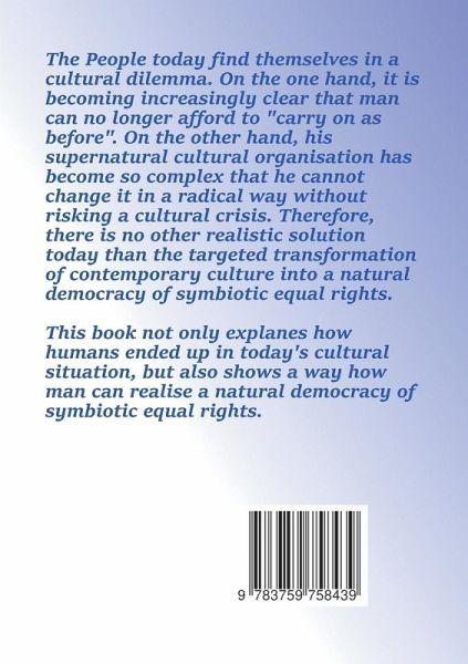 People today find themselves in a cultural dilemma. On the one hand, it is becoming increasingly clear that man can no longer afford to 'carry on as before'. On the other hand, his supernatural cultural organisation has become so complex that he cannot change it in a radical way without risking a cultural crisis. Therefore, there is no realistic solution today other than the targeted transformation of contemporary culture into a natural democracy of symbiotic equal rights. This book not only explains how humans ended up in today's cultural situation, but also shows a way how man can realize a natural democracy of symbiotic equal rights.