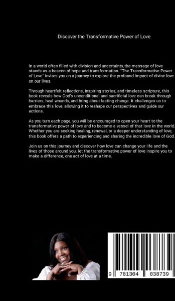 The Transformative Power of Love: A Journey Through Scripture and Life In "The Transformative Power of Love: A Journey Through Scripture and Life," Apostle Asia Roberts invites readers to explore the profound impact of divine love on our lives. This inspiring book delves into the essence of God's unconditional and sacrificial love, revealing how it can break through barriers, heal wounds, and bring about lasting change. Through heartfelt reflections, biblical insights, and personal stories, Apostle Asia guides readers on a journey to experience and embrace God's love. Each chapter offers practical wisdom and spiritual encouragement, helping readers to: ¿ Understand the true nature of love as described in scripture. ¿ Experience the healing and renewing power of God's love. ¿ Overcome barriers such as past hurts, prejudices, and fears. ¿ Become vessels of love, extending grace, compassion, and forgiveness to others. ¿ Witness the ripple effect of love, creating positive change in their communities. ¿ Live a life transformed by love, guided by faith and purpose. This book is not just a collection of teachings; it is an invitation to a deeper relationship with God and a call to live out His love in everyday life. Whether you are seeking healing, renewal, or a deeper understanding of love, "The Transformative Power of Love" offers a path to experiencing and sharing the incredible love of God. Join Apostle Asia Roberts on this transformative journey and discover how love can change your life and the lives of those around you. Let the power of love inspire you to make a difference, one act of love at a time.