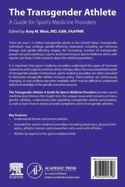 The Transgender Athlete: A Guide for Sports Medicine Providers presents sports medicine practitioners insights into the unique issues and concerns of transgender athletes in order to help them understand rules regarding transgender athlete participation and learn how to better provide competent care to transgender athletes. There are over 1.4 million transgender adults in the United States. Transgender individuals undergo gender-affirming treatments including sex hormone therapy and gender-affirming surgery. An increasing number of transgender people are participating in sports and presenting to sports medicine clinics with injuries, yet there is little research about this athlete population. It is important that sports medicine providers understand the types of hormone treatments and surgeries and how these changes affect the musculoskeletal health of transgender people. Additionally, transgender people may require specific considerations when interacting with medical providers. Furthermore, sports medicine providers are often consulted to formulate transgender athlete inclusion policy. These policies are continuously changing, as new evidence becomes available, which may be difficult to understand without knowledge of the gender transition process.