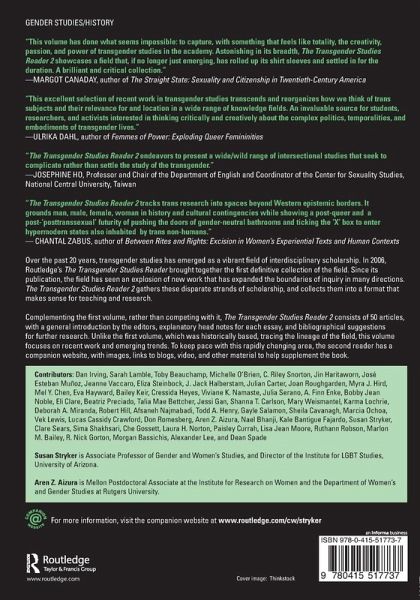 Over the past twenty years, transgender studies has emerged as a vibrant field of interdisciplinary scholarship. In 2006, Routledge's The Transgender Studies Reader brought together the first definitive collection of the field. Since its publication, the field has seen an explosion of new work that has expanded the boundaries of inquiry in many directions. The Transgender Studies Reader 2 gathers these disparate strands of scholarship, and collects them into a format that makes sense for teaching and research.