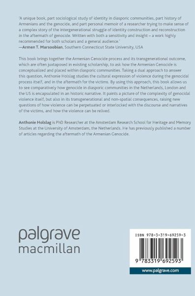 This book brings together the Armenian Genocide process and its transgenerational outcome, which are often juxtaposed in existing scholarship, to ask how the Armenian Genocide is conceptualized and placed within diasporic communities. Taking a dual approach to answer this question, Anthonie Holslag studies the cultural expression of violence during the genocidal process itself, and in the aftermath for the victims. By using this approach, this book allows us to see comparatively how genocide in diasporic communities in the Netherlands, London and the US is encapsulated in an historic narrative. It paints a picture of the complexity of genocidal violence itself, but also in its transgenerational and non-spatial consequences, raising new questions of how violence can be perpetuated or interlocked with the discourse and narratives of the victims, and how the violence can be relived.