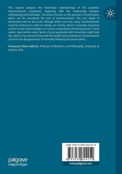 This volume analyzes the theoretical underpinnings of the academic transhumanism movement, beginning with the relationship between anthropology and technique. The author focuses on the question of immortality, which can be considered the core of transhumanism. The true depth of immortality will be discussed, through which and how many transformations could be produced in order to change our society, which is basically shaped by and for human mortal beings, in a society composed by immortal persons. Some writers have written about what a future populated with immortals might look like, which is far removed from both the bright future painted by transhumanists and from the disappearance of humanity feared by bioconservatives.