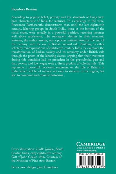 According to widespread belief, poverty and low standards of living have been characteristic of India for centuries. Challenging this view, Prasannan Parthasarathi demonstrates that, until the late eighteenth century, labouring groups in South India, those at the bottom of the social order, were in a powerful position, receiving incomes well above subsistence. The decline in their economic fortunes, the author asserts, was a process initiated towards the end of that century, with the rise of colonial rule. Building on revisionist interpretations, he examines the transformation of Indian society and its economy under British rule through the prism of the labouring classes, arguing that their treatment by the early colonial state had no precedent in the pre-colonial past and that poverty and low wages were a product of colonial rule. The book promises to make an important contribution to the economic history of the region, and to the study of colonialism.