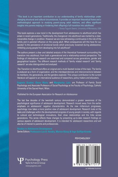 This book explores the development of a new path of transition between adolescence and adulthood in recent generations. Whereas traditionally the transition into adulthood was marked by a clear and irreversible change in condition, we are now seeing a continuance in the role and influence of the family on the young adult. What consequences does this have for our society? Is the persistence of emotional bonds which previously loosened during adolescence, inhibiting young people from developing into full adulthood? The authors present a clear and in-depth analysis of the theoretical framework surrounding the transition into adulthood both from a generational point of view and a relationship-centred perspective. The findings of international research are presented and compared across generations, gender and geographical location within Europe. The different research methods of 'family related research' and 'family research' are also distinguished and analysed. This volume offers an original and multi-faceted review of this topic. The family is considered as an organization, and the interdependencies and interconnections between its members, the generations and genders investigated. It offers a unique contribution to the current literature and will appeal to an international audience of researchers, policy makers and educators both in academic and professional spheres.