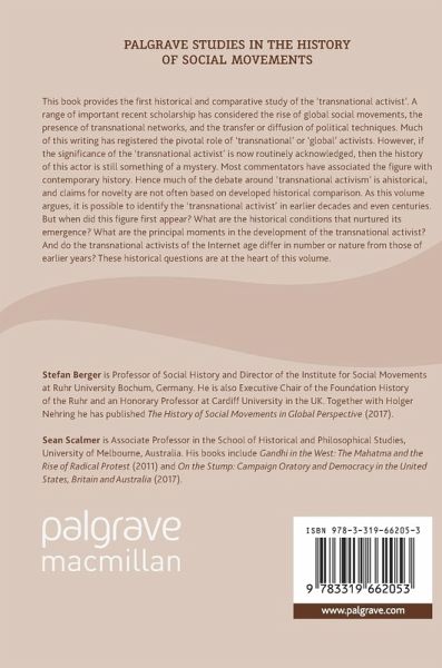 Chapter One: The Transnational Activist: An Introduction; Stefan Berger and Sean Scalmer.- Chapter Two: Activism in the Antipodes: Transnational Quaker Humanitarianism and the Troubled Politics of Compassion in the Early Nineteenth Century; Penelope Edmonds.- Chapter Three: Not a Man of his own Time: Roger Casement and Transnational Activism; Mariana Bolfarine.- Chapter Four: Empire and Activism: Gandhi, Imperialism, and the Global Career of Satyagraha; Sean Scalmer.- Chapter Five: Translating Anti-capitalism throughout the Empire: Tom Mann and John Curtin as Transnational Activists, 1902-1916; Liam Byrne.- Chapter Six: Marceau Pivert and the Travails of an International Socialist; Talbot Imlay.- Chapter Seven: The Making of a Transnational Activist: The Indonesian Human Rights Campaigner Carmel Budiardjo; Katharine McGregor.- Chapter Eight: Speaking Out for Justice: Bella Galhos and the International Campaign for the Independence of East Timor; Hannah Loney.- Chapter Nine: Jessie Street: Activism without Discrimination; Chloe Ward.- Chapter Ten: A Very Rooted Cosmopolitan: EP Thompson`s Englishness and His Transnational Activism; Stefan Berger and Christian Wicke.- Chapter Eleven: From the Local to the Global and Back Again: The Rainforest Information Centre and Transnational Environmental Activism in the 1980s; Iain McIntyre.- Chapter Twelve: Animal Rights Without Borders: Lyn White & Transnational Investigative Campaigning; Gonzalo Villanueva.- Chapter Thirteen: Afterword: Transnational Activisms in Social Movement Studies; Donatella della Porta.