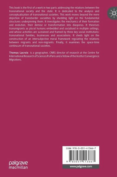 This book is the first of a work in two parts addressing the relations between the transnational society and the state. It is dedicated to the analysis and conceptualisation of transnational societies. This work moves beyond the mere depiction of transborder socialities by shedding light on the fundamental structures underpinning them. It investigates the mechanics of their formation and evolution, their demise or transformation into diasporas. It theorises transmigrants as plural humans embedded and socialised in multiple settings, and whose activities are sustained and framed by three key social institutions: transnational families, businesses and associations. It sheds light on the construction of an intersubjective moral framework regulating the relations between migrants and non-migrants. Finally, it examines the space-time continuum of transnational societies.