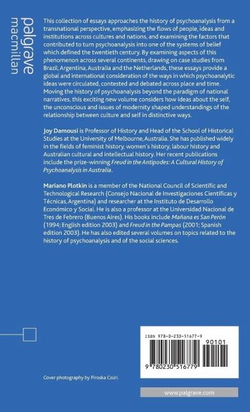 Introduction; J.Damousi and M.Plotkin PART I: PSYCHOANALYSIS AND TRANSNATIONAL MODERNISM Three Roads from Vienna: Psychoanalysis, Modernism and Social Welfare; E.A. Danto Beyond the Blues: Richard Wright, Psychoanalysis, and the Modern Idea of Culture; E.Zarestsky PART II: PSYCHOANALYSIS AND TRANSNATIONAL POLITICS Primitivity, Animism and Psychoanalysis: European visions of the Native 'Soul' in the Dutch East Indies, 1900-1949; F.Gouda Fascism Becomes Desire: On Freud, Mussolini and Transnational Politics; F.Finchelstein PART III: THE TRANSNATIONAL DIFFUSION OF PSYCHOANALYSIS The Travelling Psychoanalyst: Andrew Peto and Transnational Explorations of Psychoanalysis in Budapest, Sydney and New York; J.Damousi Psychoanalysis, Transnationalism and National Habitus: A Comparative Approach to the Reception of Psychoanalysis in Argentina and Brazil' (1910s-1940s); M.B.Plotkin PART IV: CHALLENGING CENTRE AND PERIPHERY Paris-London-Buenos Aires: the Adventures of Kleinian Psychoanalysis between Europe and South America; A.Dagfal The Lacanian movement in Argentina and Brazil: the periphery becomes the center; J.Russo Origin stories, invention of genealogies and the early diffusion of Lacanian psychoanalysis in Argentina and Spain (1960-1980); S.Visacovsky
