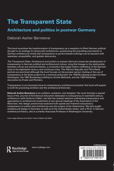 Acknowledgements Introduction 1. Transparency Ideology 2. Transparency in German Architecture before and after the War 3. The Quest for an Open Society 4. Looking in the Mirror: Transparency after 1989 5. A Metaphor for the New Germany 6. House of Openness, Architecture of Encounter 7. Coming to Terms with the Past: Transparency in Norman Foster's Reichstag 8. Why Transparency? Appendix 1: Biography of Hans Schwippert Appendix 2: Biography of Günter Behnisch Appendix 3: Biography of Sir Norman Foster Appendix 4: Glück und Glas, Hans Schwippert Bibliography