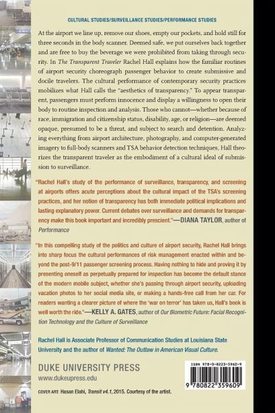 At the airport we line up, remove our shoes, empty our pockets, and hold still for three seconds in the body scanner. Deemed safe, we put ourselves back together and are free to buy the beverage we were prohibited from taking through security. In The Transparent Traveler Rachel Hall explains how the familiar routines of airport security choreograph passenger behavior to create submissive and docile travelers. The cultural performance of contemporary security practices mobilizes what Hall calls the "aesthetics of transparency." To appear transparent, a passenger must perform innocence and display a willingness to open their body to routine inspection and analysis. Those who cannot-whether because of race, immigration and citizenship status, disability, age, or religion-are deemed opaque, presumed to be a threat, and subject to search and detention. Analyzing everything from airport architecture, photography, and computer-generated imagery to full-body scanners and TSA behavior detection techniques, Hall theorizes the transparent traveler as the embodiment of a cultural ideal of submission to surveillance.