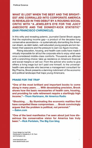 "Takes dead aim at the conservative economic consensus that has dominated U.S. politics . . . Biting and necessary."-The American Prospect In this witty and revealing polemic, journalist Daniel Brook's The Trap argues that the exploding income gap-a product of the conservative ascendance-is systematically dismantling the American dream, as debt-laden, well-educated young people are torn between their passions and the pressure to earn six-figure incomes. Rising education, housing, and health-care costs have made it virtually impossible for all but the corporate elite to enjoy what were once considered middle-class comforts. Thousands are afflicted with a wrenching choice: take up residence on America's financial and social margins or sell out. From the activist who works to give others a living wage but isn't paid one himself, to the universal health-care advocate who becomes a management consultant for Big Pharma, Brook presents a damning indictment of the economic and political landscape that traps young Americans.