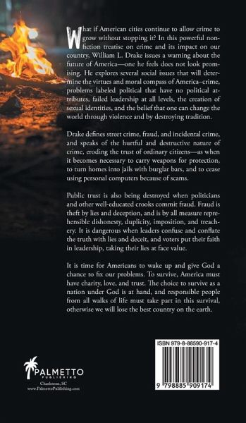 What if American cities continue to allow crime to grow without stopping it? In this powerful non-fiction treatise on crime and its impact on our country, William L. Drake issues a warning about the future of America-one he feels does not look promising. He explores several social issues that will determine the virtues and moral compass of America-crime, problems labeled political that have no political attributes, failed leadership at all levels, the creation of sexual identities, and the belief that one can change the world through violence and by destroying tradition. Drake defines street crime, fraud, and incidental crime, and speaks of the hurtful and destructive nature of crime, eroding the trust of ordinary citizens-as when it becomes necessary to carry weapons for protection, to turn homes into jails with burglar bars, and to cease using personal computers because of scams. Public trust is also being destroyed when politicians and other well-educated crooks commit fraud. Fraud is theft by lies and deception, and is by all measure reprehensible dishonesty, duplicity, imposition, and treachery. It is dangerous when leaders confuse and conflate the truth with lies and deceit, and voters put their faith in leadership, taking their lies at face value. It is time for Americans to wake up and give God a chance to fix our problems. To survive, America must have charity, love, and trust. The choice to survive as a nation under God is at hand, and responsible people from all walks of life must take part in this survival, otherwise we will lose the best country on the earth.