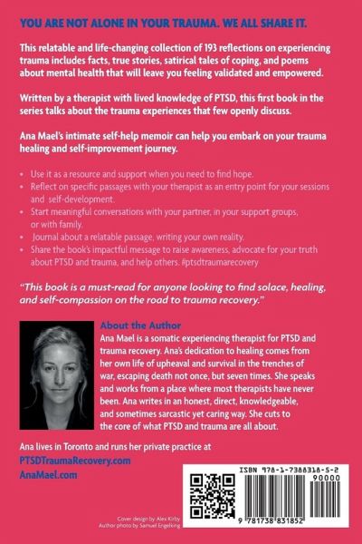 You are not alone in your trauma. We all share it. Discover the hidden truths about trauma, healing and self-discovery in "The Trauma We Don't Talk About " Volume II series. This relatable and life-changing collection of 193 reflections on experiencing trauma includes facts, real stories, satirical tales of coping, and poems about mental health that will leave you feeling validated and empowered. Written by a therapist with lived knowledge of PTSD, this first book in the series talks about the trauma experiences that few openly discuss. "This book is for the silent and invisible victims of discrimination, violence, social stigma, and abuse. The marginalized and "othered" are very skilled in keeping a low profile. They have been repeatedly hurt, and aware of the stereotypes applied to their group. They are all around us, right in our community, on the job, or residing in our own homes. They are our children, friends, relatives, co-workers, neighbors, partners, baristas, teachers, and "cool" folks we meet. They are you and me." Ana Mael's intimate self-help memoir can help you embark on your trauma healing and self-improvement journey. *Use it as a resource and support when you need to find hope. * Reflect on specific passages with your therapist as an entry point for your sessions and self-development. * Start meaningful conversations with your partner, in your support groups, or with family. * Journal about a relatable passage, writing your own reality. What will you discover? Unveiling the Hidden Truths: Discover the Power of Healing and Self-Discovery in ``The Trauma We Don't Talk About.`` 1. You Are Not Alone: Discover solace in the shared experience. 2. 193 Essays: Will leave you feeling validated and empowered. 3. Source for Self Development: Bring relevant essay to your therapist, start conversation 4. Tools for Living: Embark on a journey towards self-development and healing.