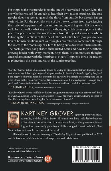 For the poet, the true traveler is not the one who has walked the world, but the one who has walked far enough to hear their own racing heartbeat. The true traveler does not seek to quench the thirst from outside, but already has an oasis within. For the poet, this state of the traveler comes from experiencing the stories of happiness and pain and continuing walking even if it is a lonely walk. In such walks, what stays are the thoughts, which come as poems to the poet. The poems reflect the world as seen from the eyes of a wanderer who is following the directions of their heart. The poet relies heavily on personification of human emotions such as through a river flow or sometimes through the voices of the moon, sky, or a bird to bring out a desire for oneness in life. The poet's journey has polished their rusted heart and now their heartbeat, growing louder with every moment, helps them to communicate thoughts and seek resonance with the heartbeat in others. The poems invite the readers to plunge into this oasis and watch the sunrise together.