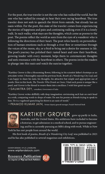 For the poet, the true traveler is not the one who has walked the world, but the one who has walked far enough to hear their own racing heartbeat. The true traveler does not seek to quench the thirst from outside, but already has an oasis within. For the poet, this state of the traveler comes from experiencing the stories of happiness and pain and continuing walking even if it is a lonely walk. In such walks, what stays are the thoughts, which come as poems to the poet. The poems reflect the world as seen from the eyes of a wanderer who is following the directions of their heart. The poet relies heavily on personification of human emotions such as through a river flow or sometimes through the voices of the moon, sky, or a bird to bring out a desire for oneness in life. The poet's journey has polished their rusted heart and now their heartbeat, growing louder with every moment, helps them to communicate thoughts and seek resonance with the heartbeat in others. The poems invite the readers to plunge into this oasis and watch the sunrise together.