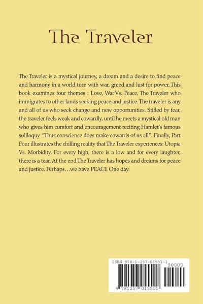 The Traveler is a mystical journey, a dream and a desire to find peace and harmony in a world torn with war, greed and lust for power.