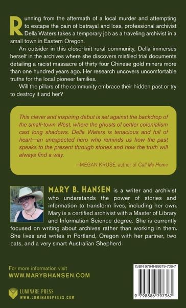 Running from the aftermath of a local murder and attempting to escape the pain of betrayal and loss, professional archivist Della Waters takes a temporary job as a traveling archivist in a small town in Eastern Oregon. An outsider in this close-knit rural community, Della immerses herself in the archives where she discovers misfiled trial documents detailing a racist massacre of thirty-four Chinese gold miners more than one hundred years ago. Her research uncovers uncomfortable truths for the local pioneer families. Will the pillars of the community embrace their hidden past or try to destroy it and her?