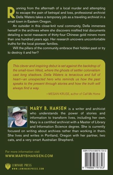 Running from the aftermath of a local murder and attempting to escape the pain of betrayal and loss, professional archivist Della Waters takes a temporary job as a traveling archivist in a small town in Eastern Oregon. An outsider in this close-knit rural community, Della immerses herself in the archives where she discovers misfiled trial documents detailing a racist massacre of thirty-four Chinese gold miners more than one hundred years ago. Her research uncovers uncomfortable truths for the local pioneer families. Will the pillars of the community embrace their hidden past or try to destroy it and her?