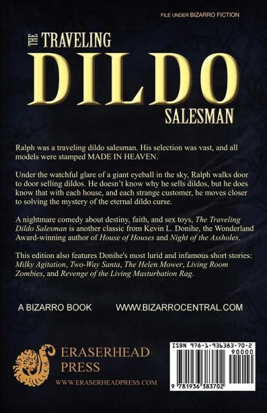 Ralph was a traveling dildo salesman. His selection was vast, and all models were stamped MADE IN HEAVEN. Under the watchful glare of a giant eyeball in the sky, Ralph walks door to door selling dildos. He doesn't know why he sells dildos, but he does know that with each house, and each strange customer, he moves closer to solving the mystery of the eternal dildo curse. A nightmare comedy about destiny, faith, and sex toys, The Traveling Dildo Salesman is another classic from Kevin L. Donihe, the Wonderland Award-winning author of House of Houses and Night of the Assholes. This edition also features Donihe's most lurid and infamous short stories: Milky Agitation, Two-Way Santa, The Helen Mower, Living Room Zombies, and Revenge of the Living Masturbation Rag.