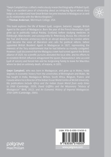 This book explores the life of Robert Lyall, surgeon, botanist, voyager, British Agent to the court of Madagascar. Born the year of the French Revolution, Lyall grew up in politically radical Paisley, Scotland, before studying medicine, in Edinburgh, Manchester, and subsequently St. Petersburg, Russia. His criticism of the Tsar and Russian aristocracy led to an abrupt departure for London where Lyall became the voice of liberalism and calls for political reform, before appointed British Resident Agent in Madagascar in 1827, representing the interests of the Tory establishment that he had hitherto so roundly castigated. However, Lyall discovered that the Malagasy crown had turned against the British alliance of 1820, his scientific pursuits alienated the local elite, and his efforts to re-establish British influence antagonized the queen, Ranavalona I, who accused Lyall of sorcery and forced him and his burgeoning family to leave for Mauritius where he died an untimely death, of malaria, in 1831.