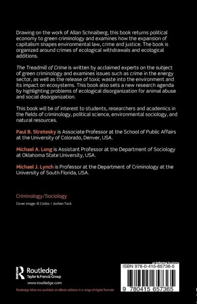 "The Treadmill of Crime proves itself to be a major development in green criminology research. Stretesky, Long, and Lynch succeed in providing criminologists with an important, interdisciplinary theoretical perspective on why green crimes occur, which keeps political economy as the fundamental component in the understanding of environmental harm. The application of ToP in Treadmill of Crime makes the text rich with numerous examples of green crime, drawing from criminology, sociology, environmental studies, and public health literature. As such, The Treadmill of Crime is relevant for a wide audience, and is not only an important read for professionals engaged in green criminology research, but may also be of interest to practitioners working in areas of corporate crime, environmental justice, conservation, and/or environmental law. This book is also appropriate for graduate and undergraduate students, and could readily be adapted as a supporting text in a green criminology, environmental crime, environmental sociology, environmental justice, or corporate crime course."