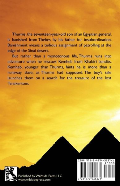 Thurms, seventeen-year-old son of an Egyptian general, is banished from Thebes by his father for insubordination. Banishment means a tedious assignment of patrolling at the edge of the Sinai desert. But rather than a monotonous life, Thurms runs into adventure when he rescues Kemheb from Khabiri bandits. Kemheb, younger than Thurms, hints he is more than a runaway slave, as Thurms had supposed. His tale results in the pursuit of the treasure of the lost Tenakertom.