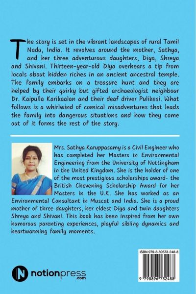 The story is set in the vibrant landscapes of rural Tamil Nadu, India. It revolves around the mother, Sathya, and her three adventurous daughters, Diya, Shreya and Shivani. Thirteen-year-old Diya overhears a tip from locals about hidden riches in an ancient ancestral temple. The family embarks on a treasure hunt and they are helped by their quirky but gifted archaeologist neighbour Dr. Kaipulla Karikaalan and their deaf driver Pulikesi. What follows is a whirlwind of comical misadventures that leads the family into dangerous situations and how they come out of it forms the rest of the story.