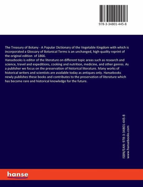 The Treasury of Botany - A Popular Dictionary of the Vegetable Kingdom with which is incorporated a Glossary of Botanical Terms is an unchanged, high-quality reprint of the original edition of 1866.Hansebooks is editor of the literature on different topic areas such as research and science, travel and expeditions, cooking and nutrition, medicine, and other genres. As a publisher we focus on the preservation of historical literature. Many works of historical writers and scientists are available today as antiques only. Hansebooks newly publishes these books and contributes to the preservation of literature which has become rare and historical knowledge for the future.