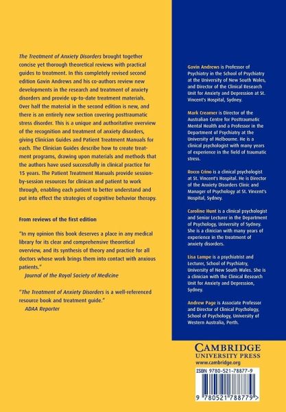 In this completely revised second edition of their well-received book, Gavin Andrews and his team continue to draw upon materials and methods that they have used successfully in clinical practice for 15 years. Over half the material in the second edition is new, and there is an entirely new section covering post-traumatic stress disorder. This is a unique and authoritative overview of the recognition and treatment of anxiety disorders, giving Clinician Guides and Patient Treatment Manuals for each. The Clinician Guides describe how to create a treatment program, and by working through the Patient Treatment Manual together with the clinician enables each patient to understand and put into effect the strategies of cognitive behaviour therapy. The Treatment of Anxiety Disorders offers both a theoretical overview and a framework to help psychiatrists and clinical psychologists build successful treatment programs.