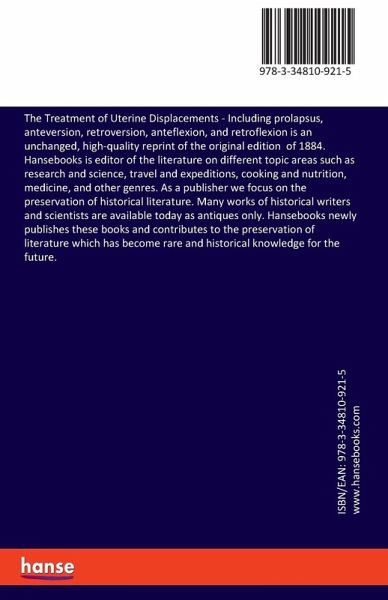The Treatment of Uterine Displacements - Including prolapsus, anteversion, retroversion, anteflexion, and retroflexion is an unchanged, high-quality reprint of the original edition of 1884.Hansebooks is editor of the literature on different topic areas such as research and science, travel and expeditions, cooking and nutrition, medicine, and other genres. As a publisher we focus on the preservation of historical literature. Many works of historical writers and scientists are available today as antiques only. Hansebooks newly publishes these books and contributes to the preservation of literature which has become rare and historical knowledge for the future.