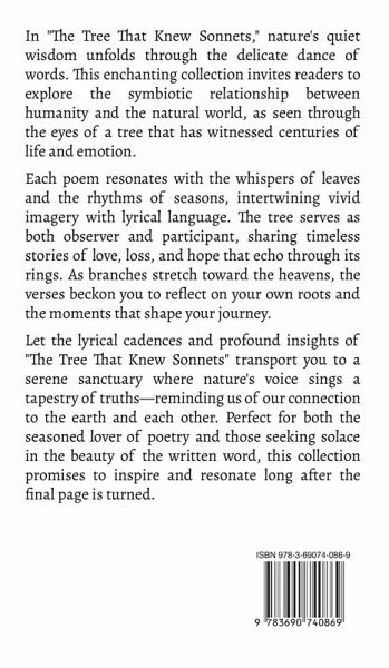 In "The Tree That Knew Sonnets," nature's quiet wisdom unfolds through the delicate dance of words. This enchanting collection invites readers to explore the symbiotic relationship between humanity and the natural world, as seen through the eyes of a tree that has witnessed centuries of life and emotion. Each poem resonates with the whispers of leaves and the rhythms of seasons, intertwining vivid imagery with lyrical language. The tree serves as both observer and participant, sharing timeless stories of love, loss, and hope that echo through its rings. As branches stretch toward the heavens, the verses beckon you to reflect on your own roots and the moments that shape your journey. Let the lyrical cadences and profound insights of "The Tree That Knew Sonnets" transport you to a serene sanctuary where nature's voice sings a tapestry of truths-reminding us of our connection to the earth and each other. Perfect for both the seasoned lover of poetry and those seeking solace in the beauty of the written word, this collection promises to inspire and resonate long after the final page is turned.