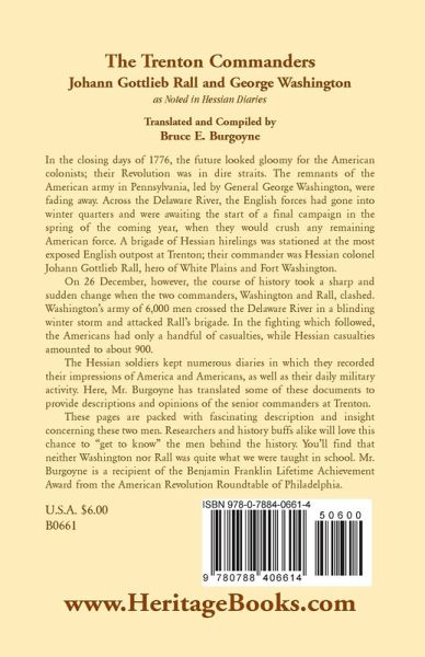 In the closing days of 1776, the future looked gloomy for the American colonists; their Revolution was in dire straits. The remnants of the American army in Pennsylvania, led by General George Washington, were fading away. Across the Delaware River, the English forces had gone into winter quarters and were awaiting the start of a final campaign in the spring of the coming year, when they would crush any remaining American force. A brigade of Hessian hirelings was stationed at the most exposed English outpost at Trenton; their commander was Hessian colonel Johann Gottlieb Rall, hero of White Plains and Fort Washington. On 26 December, however, the course of history took a sharp and sudden change when the two commanders, Washington and Rall, clashed. Washington's army of 6,000 men crossed the Delaware River in a blinding winter storm and attacked Rall's brigade. In the fighting which followed, the Americans had only a handful of casualties, while Hessian casualties amounted to about 900. The Hessian soldiers kept numerous diaries in which they recorded their impressions of America and Americans, as well as their daily military activity. Here, Mr. Burgoyne has translated some of these documents to provide descriptions and opinions of the senior commanders at Trenton. These pages are packed with fascinating description and insight concerning these two men. Researchers and history buffs alike will love this chance to "get to know" the men behind the history. You'll find that neither Washington nor Rall was quite what we were taught in school. Mr. Burgoyne is a recipient of the Benjamin Franklin Lifetime Achievement Award from the American Revolution Roundtable of Philadelphia.