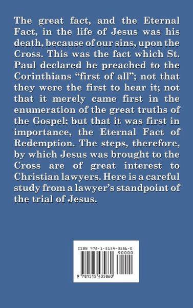 The great fact, and the Eternal Fact, in the life of Jesus was his death, because of our sins, upon the Cross. This was the fact which St. Paul declared he preached to the Corinthians "first of all"; not that they were the first to hear it; not that it merely came first in the enumeration of the great truths of the Gospel; but that it was first in importance, the Eternal Fact of Redemption. The steps, therefore, by which Jesus was brought to the Cross are of great interest to Christian lawyers.