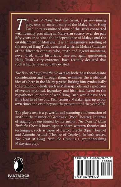 The Trial of Hang Tuah the Great, a prize-winning play, uses an ancient story of the Malay hero, Hang Tuah, to re-examine of some of the issues connected with identity prevailing in Malaysian society over the past fifty years or so since the independence of Malaya and the establishment of Malaysia. It is an imaginative retelling of the story of Hang Tuah, associated with the Melaka Sultanate of the fifteenth century who, myth and legend maintains, never died, while historians, time and again questioning Hang Tuah's very existence, have recently declared that such a figure never actually existed. The Trial of Hang Tuah the Great takes both these theories into consideration and through them, examines the traditional idea of a hero in the Malay psyche, linking him symbolically to certain individuals, such as Maharaja Lela, and a spectrum of events, mythical, legendary and historical, based on the hypothetical question of who Hang Tuah would have been if he had lived beyond 15th century Melaka right up to our own times and even beyond the present until the year 2020. The play's text is a powerful and stunning confrontation of myth in the manner of Grotowski (Poor Theatre). In terms of staging, as envisioned by its author, The Trial of Hang Tuah the Great is based upon modern western theories and techniques, such as those of Bertolt Brecht (Epic Theatre) and Antonin Artaud (Theatre of Cruelty). In both senses, The Trial of Hang Tuah the Great is a groundbreaking Malaysian play.