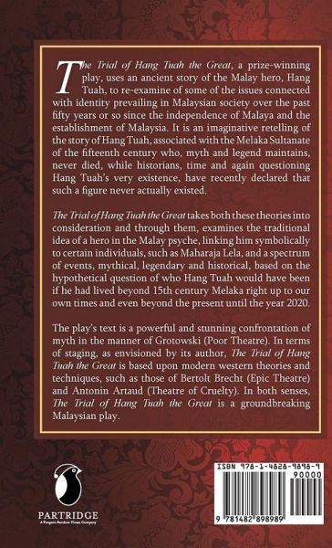 The Trial of Hang Tuah the Great, a prize-winning play, uses an ancient story of the Malay hero, Hang Tuah, to re-examine of some of the issues connected with identity prevailing in Malaysian society over the past fifty years or so since the independence of Malaya and the establishment of Malaysia. It is an imaginative retelling of the story of Hang Tuah, associated with the Melaka Sultanate of the fifteenth century who, myth and legend maintains, never died, while historians, time and again questioning Hang Tuah's very existence, have recently declared that such a figure never actually existed. The Trial of Hang Tuah the Great takes both these theories into consideration and through them, examines the traditional idea of a hero in the Malay psyche, linking him symbolically to certain individuals, such as Maharaja Lela, and a spectrum of events, mythical, legendary and historical, based on the hypothetical question of who Hang Tuah would have been if he had lived beyond 15th century Melaka right up to our own times and even beyond the present until the year 2020. The play's text is a powerful and stunning confrontation of myth in the manner of Grotowski (Poor Theatre). In terms of staging, as envisioned by its author, The Trial of Hang Tuah the Great is based upon modern western theories and techniques, such as those of Bertolt Brecht (Epic Theatre) and Antonin Artaud (Theatre of Cruelty). In both senses, The Trial of Hang Tuah the Great is a groundbreaking Malaysian play.