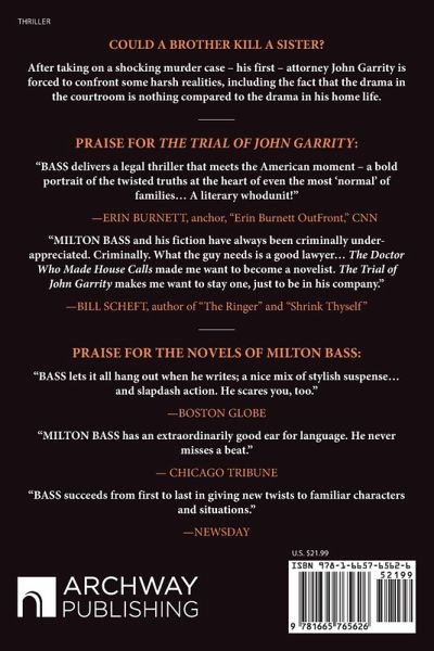 "BASS delivers a legal thriller that meets the American moment - a bold portrait of the twisted truths at the heart of even the most 'normal' of families... A literary whodunit!" -- ERIN BURNETT, anchor, "Erin Burnett Out Front," CNN "MILTON BASS and his fiction have always been criminally under-appreciated... What the guy needs is a good lawyer. The Doctor Who Made House Calls made me want to become a novelist. The Trial of John Garrity makes me want to stay one, just to be in his company." -- BILL SCHEFT, author of "The Ringer" and "Shrink Thyself" John Garrity is a wealthy Irish-Catholic attorney living the country club life in a small New England city with his wife, Rebeccah, and their six kids. The Garritys seem to have it all, but their picture-perfect family portrait belies the troubles within. When a judge offers Garrity a pro bono murder case -- a young man from the opposite end of the social spectrum, Charles Cooper, is accused of murdering his 14-year-old half-sister - he takes it out of boredom, even though he has never worked as a criminal defense attorney. Garrity's bumbling attempts at investigating the murder mystery, and his frustrations with his client's family, put him on a path to potential failure for the first time. The story unfolds as a both a legal thriller and a three-dimensional family drama, with Garrity having to confront unspoken truths about himself, his household and, especially, his relationship with his wife. As events in the courtroom approach a boiling point, he comes face-to-face with the harsh realization that the Garritys have a startling amount in common with the family of the victim and the young man he is defending. Can he overcome it all to save his client, his practice, and, most importantly, his family? Praise for the novels of Milton Bass: "BASS lets it all hang out when he writes; a nice mix of stylish suspense... and slapdash action. He scares you, too." --BOSTON GLOBE "MILTON BASS has an extraordinarily good ear for language. He never misses a beat." --CHICAGO TRIBUNE "BASS succeeds from first to last in giving new twists to familiar characters and situations." --NEWSDAY