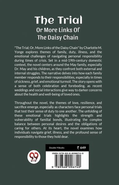 ""The Trial; Or, More Links of the Daisy Chain"" by Charlotte M. Yonge explores themes of family, duty, illness, and the emotional challenges of navigating personal responsibility during times of crisis. Set in a mid-19th-century domestic context, the novel centers around the May family, especially Dr. May and his children, as they confront both external and internal struggles. The narrative delves into how each family member responds to their responsibilities, especially in times of sickness, grief, and emotional turmoil. The story opens with a sense of both celebration and foreboding, as recent weddings and social interactions give way to darker concerns about the health and well-being of loved ones. Throughout the novel, the themes of love, resilience, and sacrifice emerge, especially as characters face personal trials that test their sense of duty to one another. The unfolding of these emotional trials highlights the strength and vulnerability of familial bonds, illustrating the complex balance between personal desires and the obligations of caring for others. At its heart, the novel examines how individuals navigate grief, illness, and the profound sense of responsibility to those they hold dear.