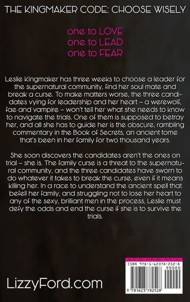 One to love. One to lead. One to Fear. Leslie Kingmaker has three weeks to choose a leader for the supernatural community, find her soul mate and break a curse. To make matters worse, the three candidates vying for leadership and her heart – a werewolf, fae and vampire – won’t tell her what she needs to know to navigate the trials. One of them is supposed to betray her, and all she has to guide her is the obscure, rambling commentary in the Book of Secrets, an ancient tome that’s been in her family for two thousand years. She soon discovers the candidates aren’t the ones on trial – she is. The family curse is a threat to the supernatural community, and the three candidates have sworn to do whatever it takes to break the curse, even if it means killing her. In a race to understand the ancient spell that befell her family, and struggling not to lose her heart to any of the sexy, brilliant men in the process, Leslie must defy the odds and end the curse if she is to survive the trials.