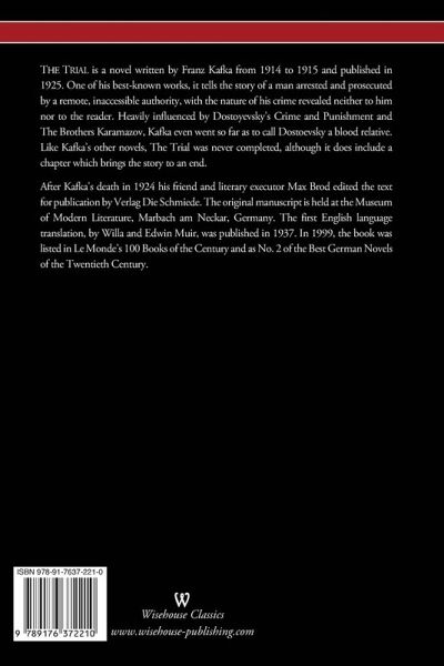 THE TRIAL is a novel written by Franz Kafka from 1914 to 1915 and published in 1925. One of his best-known works, it tells the story of a man arrested and prosecuted by a remote, inaccessible authority, with the nature of his crime revealed neither to him nor to the reader. Heavily influenced by Dostoyevsky's Crime and Punishment and The Brothers Karamazov, Kafka even went so far as to call Dostoevsky a blood relative. Like Kafka's other novels, The Trial was never completed, although it does include a chapter which brings the story to an end. After Kafka's death in 1924 his friend and literary executor Max Brod edited the text for publication by Verlag Die Schmiede. The original manuscript is held at the Museum of Modern Literature, Marbach am Neckar, Germany. The first English language translation, by Willa and Edwin Muir, was published in 1937. In 1999, the book was listed in Le Monde's 100 Books of the Century and as No. 2 of the Best German Novels of the Twentieth Century.