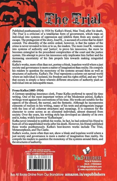 Published posthumously in 1924 by Kafka's friend, Max Trod, after his death, The Trial is a criticism of a totalitarian form of government, which traps an individual into systems of oppression and inhibits them from any means of escape. The protagonist of the story, Josef K, is accused of a crime that he didn't commit. The absurdity of the entire ordeal, however, is that the nature of the crime is never revealed to him or to us, the readers. The more Josef K ventures into systems of authority and 'justice', to prove his innocence, the more he becomes entangled in the procedural complexities of the court and the justice system. His attempt to prove his innocence only implicates him further and the increasing uncertainty of his fate propels him towards making misguided choices. Kafka's works, more often than not, portray a bleak, hopeless world where a just society and governance is more a matter of imagination than reality. He compels his readers to question the monotony of the systems around them as well as structures of authority. Kafka's The Trial represents a solemn yet surreal world where an individual is isolated; his freedom and his rights stifled; and any 'trial' that occurs is simply a farce wherein different structures of authority push an individual into an inescapable maze.