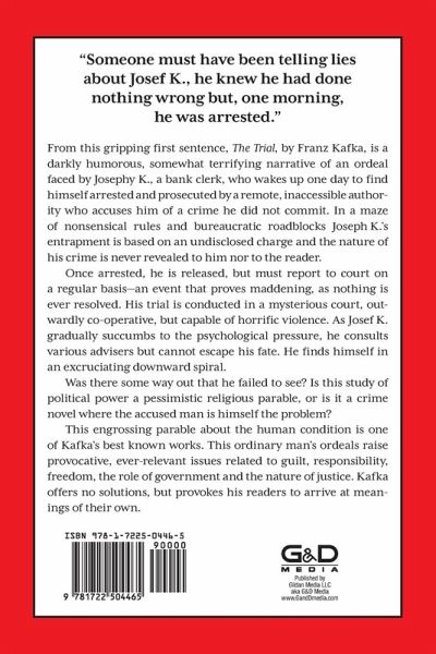 "Someone must have been telling tales about Josef K. for one morning, without having done anything wrong, he was arrested.' From this gripping first sentence, The Trial, by Franz Kafka, is a darkly humorous, somewhat terrifying narrative of an ordeal faced by Josephy K., a bank clerk, who wakes up one day to find himself arrested and prosecuted by a remote, inaccessible authority who accuses him of a crime he did not commit. In a maze of nonsensical rules and bureaucratic roadblocks Joseph K.'s entrapment is based on an undisclosed charge and the nature of his crime is never revealed to him nor to the reader. Once arrested, he is released, but must report to court on a regular basis--an event that proves maddening, as nothing is ever resolved. His trial is conducted in a mysterious court, outwardly co-operative, but capable of horrific violence. As Josef K. gradually succumbs to the psychological pressure, he consults various advisers but cannot escape his fate. He finds himself in an excruciating downward spiral. Was there some way out that he failed to see? Is this study of political power a pessimistic religious parable, or is it a crime novel where the accused man is himself the problem? This engrossing parable about the human condition is one of Kafka's best known works. This ordinary man's ordeals raise provocative, ever-relevant issues related to guilt, responsibility, freedom, the role of government and the nature of justice. Kafka offers no solutions, but provokes his readers to arrive at meanings of their own.