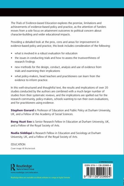 The Trials of Evidence-based Education explores the promise, limitations and achievements of evidence-based policy and practice, as the attention of funders moves from a sole focus on attainment outcomes to political concern about character-building and wider educational impacts. Providing a detailed look at the pros, cons and areas for improvement in evidence-based policy and practice, this book includes consideration of the following: What is involved in a robust evaluation for education. The issues in conducting trials and how to assess the trustworthiness of research findings. New methods for the design, conduct, analysis and use of evidence from trials and examining their implications. What policy-makers, head teachers and practitioners can learn from the evidence to inform practice. In this well-structured and thoughtful text, the results and implications of over 20 studies conducted by the authors are combined with a much larger number of studies from their systematic reviews, and the implications are spelled out for the research community, policy-makers, schools wanting to run their own evaluations, and for practitioners using evidence.