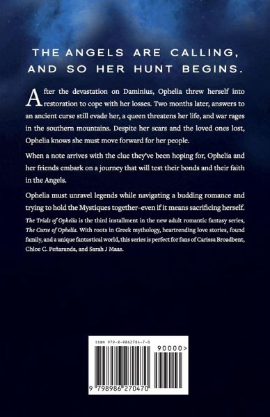 The Angels are calling, and so her hunt begins. After the devastation on Daminius, Ophelia threw herself into restoration to cope with her losses. Two months later, answers to an ancient curse still evade her, a queen threatens her life, and war rages in the southern mountains. Despite her scars and the loved ones lost, Ophelia knows she must move forward for her people. When a note arrives with the clue they've been hoping for, Ophelia and her friends embark on a journey that will test their bonds and their faith in the Angels. Ophelia must unravel legends while navigating a budding romance and trying to hold the Mystiques together-even if it means sacrificing herself. The Trials of Ophelia is the third installment in the new adult romantic fantasy series, The Curse of Ophelia. With roots in Greek mythology, heartrending love stories, found family, and a unique fantastical world, this series is perfect for fans of Carissa Broadbent, Chloe C. Peñaranda, and Sarah J Maas.