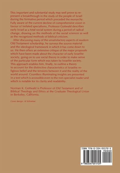 This important and substantial study may well prove to represent a breakthrough in the study of the people of Israel during the formative period which preceded the monarchy. Fully aware of the current decline of comprehensive vision in favour of isolated specialisms, Professor Gottwald describes early Israel as a total social system during a period of radical change, drawing on the methods of the social sciences as well as the recognized methods of biblical criticism. After discussing many of the unsatisfactory aspects of modern Old Testament scholarship, he surveys the source material and the ideological framework in whir h it has come down to us. He then offers an extensive critique of the major proposals which have been made about the character of early Israelite society, going on to use social theory in order to make sense of the particular form which was taken by Israelite society. This approach enables him, finally, to outline a theory to account for the distinctive characteristics of Israelite religious belief and the tensions between it and the reality of the world around. Countless illuminating insights are presented in a text which is accessible even to the non-specialist reader and hich is notable for its clarity and readability.