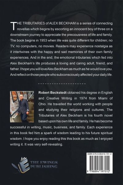 THE TRIBUTARIES of ALEX BECKHAM is a series of connecting novellas which begins by escorting an innocent boy of three on a downstream journey to appreciate the preciousness of life and family. The book begins in 1953 when life was quite different for children; no TV, no computers, no movies. Readers may experience nostalgia as it intertwines with the happy and sad memories of their own family experiences. And in the end, the emotional tributaries which fed into Alex Beckham's life produces a loving and caring adult, friend, and father. I hope you will love Alex Beckham as much as he would love you. And reflect on those people who subconsciously affected your daily life.