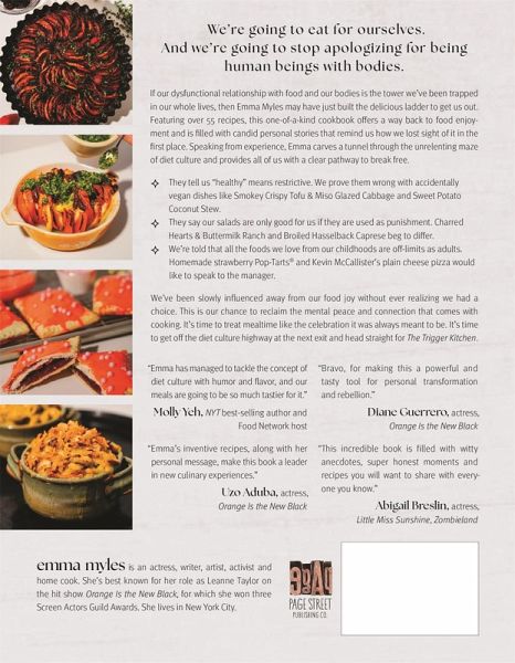 We're going to eat for ourselves. And we're going to stop apologizing for being human beings with bodies. If our dysfunctional relationship with food and our bodies is the tower we've been trapped in our whole lives, then Emma Myles may have just built the delicious ladder to get us out. Featuring over 55 recipes, this one-of-a-kind cookbook offers a way back to food enjoyment and is filled with candid personal stories that remind us how we lost sight of it in the first place. Speaking from experience, Emma carves a tunnel through the unrelenting maze of diet culture and provides all of us with a clear pathway to break free. ¿ They tell us "healthy" means restrictive. We prove them wrong with accidentally vegan dishes like Smokey Crispy Tofu & Miso Glazed Cabbage and Sweet Potato Coconut Stew. ¿ They say our salads are only good for us if they are used as punishment. Charred Hearts & Buttermilk Ranch and Broiled Hasselback Caprese beg to differ. ¿ We're told that all the foods we love from our childhoods are off-limits as adults. Homemade strawberry Pop-Tarts® and Kevin McCallister's plain cheese pizza would like to speak to the manager. We've been slowly influenced away from our food joy without ever realizing we had a choice. This is our chance to reclaim the mental peace and connection that comes with cooking. It's time to treat mealtime like the celebration it was always meant to be. It's time to get off the diet culture highway at the next exit and head straight for The Trigger Kitchen .