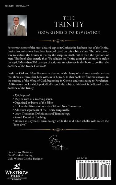 For centuries one of the most debated topics in Christianity has been that of the Trinity. Entire denominations have been founded based on this subject alone. The only correct way to address the Trinity is that by the scripture itself, rather than the opinions of men. This book does exactly that. We validate the Trinity using the scripture to tackle the topic! More than 900 passages of scripture are reference in this book to confirm the doctrine of the Triune Godhead! Both the Old and New Testaments abound with plenty of scripture to substantiate that there are three that bear witness in heaven. In this book we find the answers in the entirety of the Word of God, beginning in Genesis and continuing to Revelation. Unlike many books which periodically touch the subject, this book is dedicated to the doctrine of the Trinity! ¿ 33 Chapters! ¿ May be used as a teaching series. ¿ Organized by books of the Bible. ¿ Explore the Trinity in both the Old and New Testaments. ¿ Addresses arguments of the Trinity scripturally. ¿ Learn Trinitarian Definitions and Terminology. ¿ Sound Doctrinal Teaching. ¿ Written in Layman's Terminology while the avid bible scholar will notice the "deep dive."