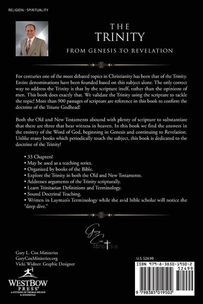 For centuries one of the most debated topics in Christianity has been that of the Trinity. Entire denominations have been founded based on this subject alone. The only correct way to address the Trinity is that by the scripture itself, rather than the opinions of men. This book does exactly that. We validate the Trinity using the scripture to tackle the topic! More than 900 passages of scripture are reference in this book to confirm the doctrine of the Triune Godhead! Both the Old and New Testaments abound with plenty of scripture to substantiate that there are three that bear witness in heaven. In this book we find the answers in the entirety of the Word of God, beginning in Genesis and continuing to Revelation. Unlike many books which periodically touch the subject, this book is dedicated to the doctrine of the Trinity! ¿ 33 Chapters! ¿ May be used as a teaching series. ¿ Organized by books of the Bible. ¿ Explore the Trinity in both the Old and New Testaments. ¿ Addresses arguments of the Trinity scripturally. ¿ Learn Trinitarian Definitions and Terminology. ¿ Sound Doctrinal Teaching. ¿ Written in Layman's Terminology while the avid bible scholar will notice the "deep dive."
